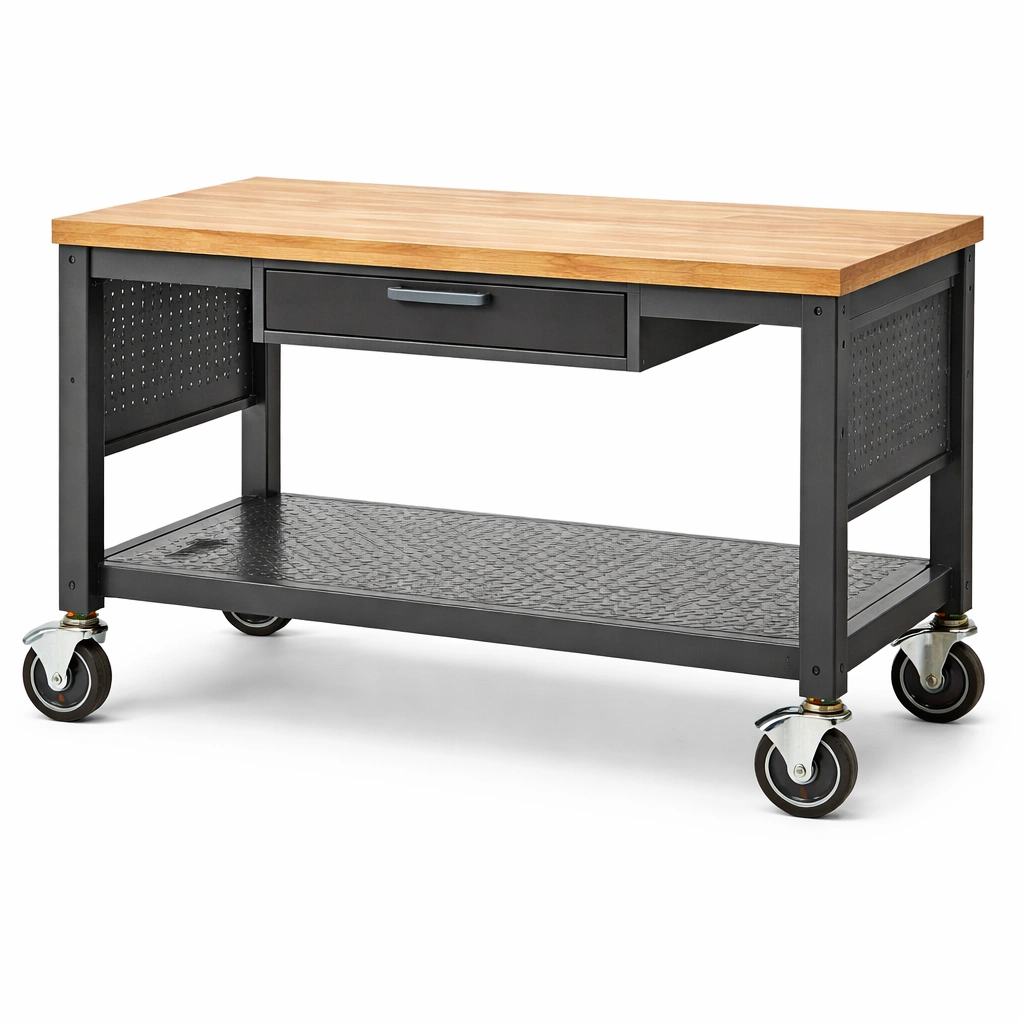 Werkbank mit Holzplatte und Stahlrahmen mit Rollen und Schublade 120x60x90 cm