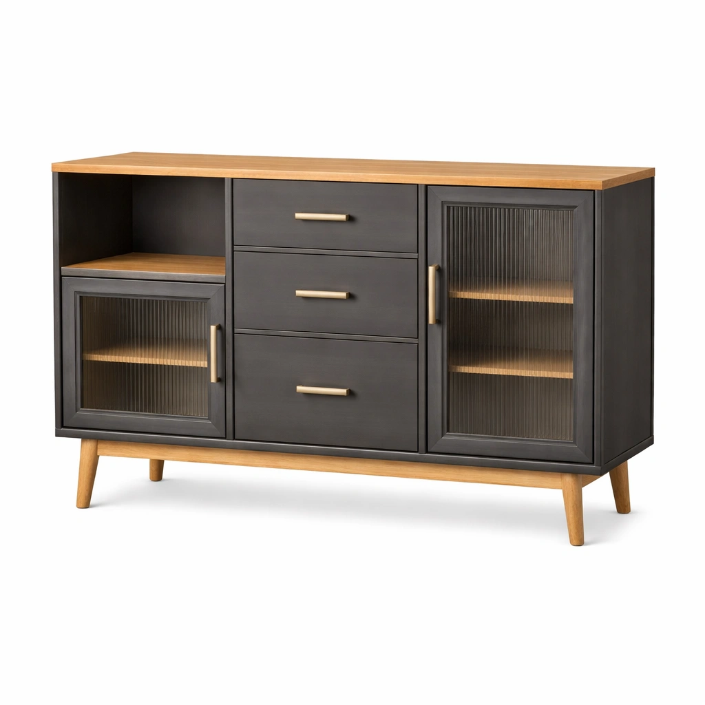 Material: MDF mit Eichenfurnier, Beine und Griffe aus massivem Eichenholz, Türen mit geriffeltem Glas